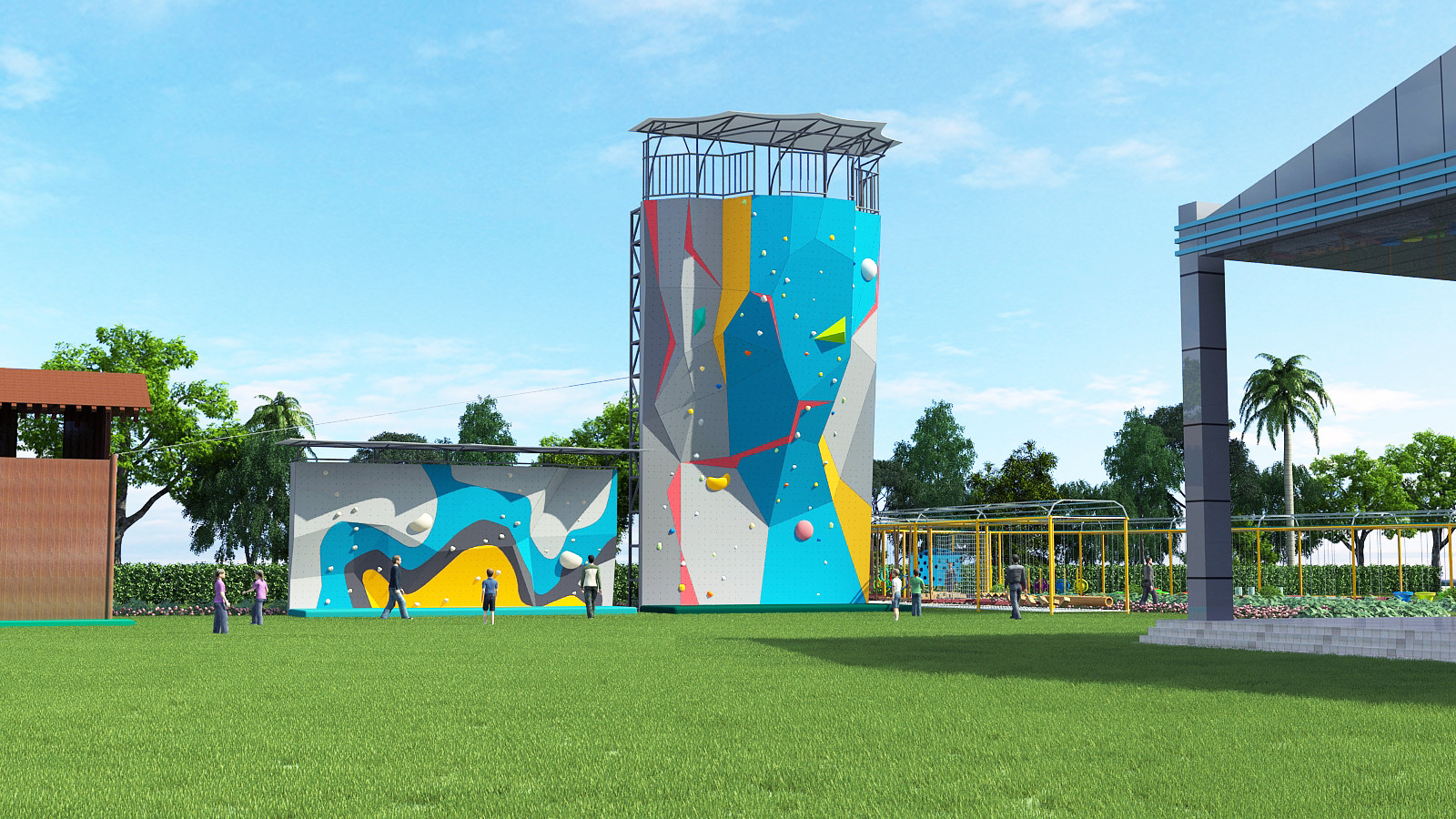 3. Angolo di parete: Le pareti rampicanti all'aperto possono avere vari angoli della pendenza, pareti verticali urtanti, pareti inclinate sporgersi e delle pareti, per accomodare per i livelli differenti della difficoltà e le abilità rampicanti.